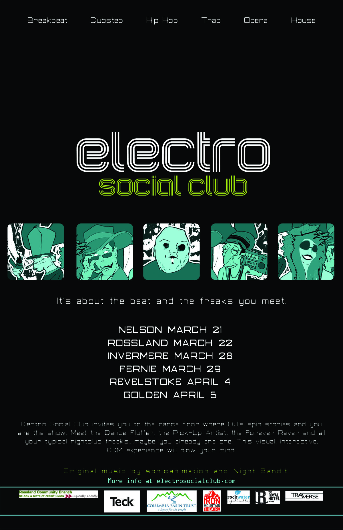 Electro Social Club invites you to the dance floor where DJ’s spin stories and you are the show. Meet all the typical nightclub freaks- The Dance Fluffer, the Pick-Up Artist, The Forever Raver, etc….Maybe you already are one. This visual, interactive, EDM experience will blow your mind.