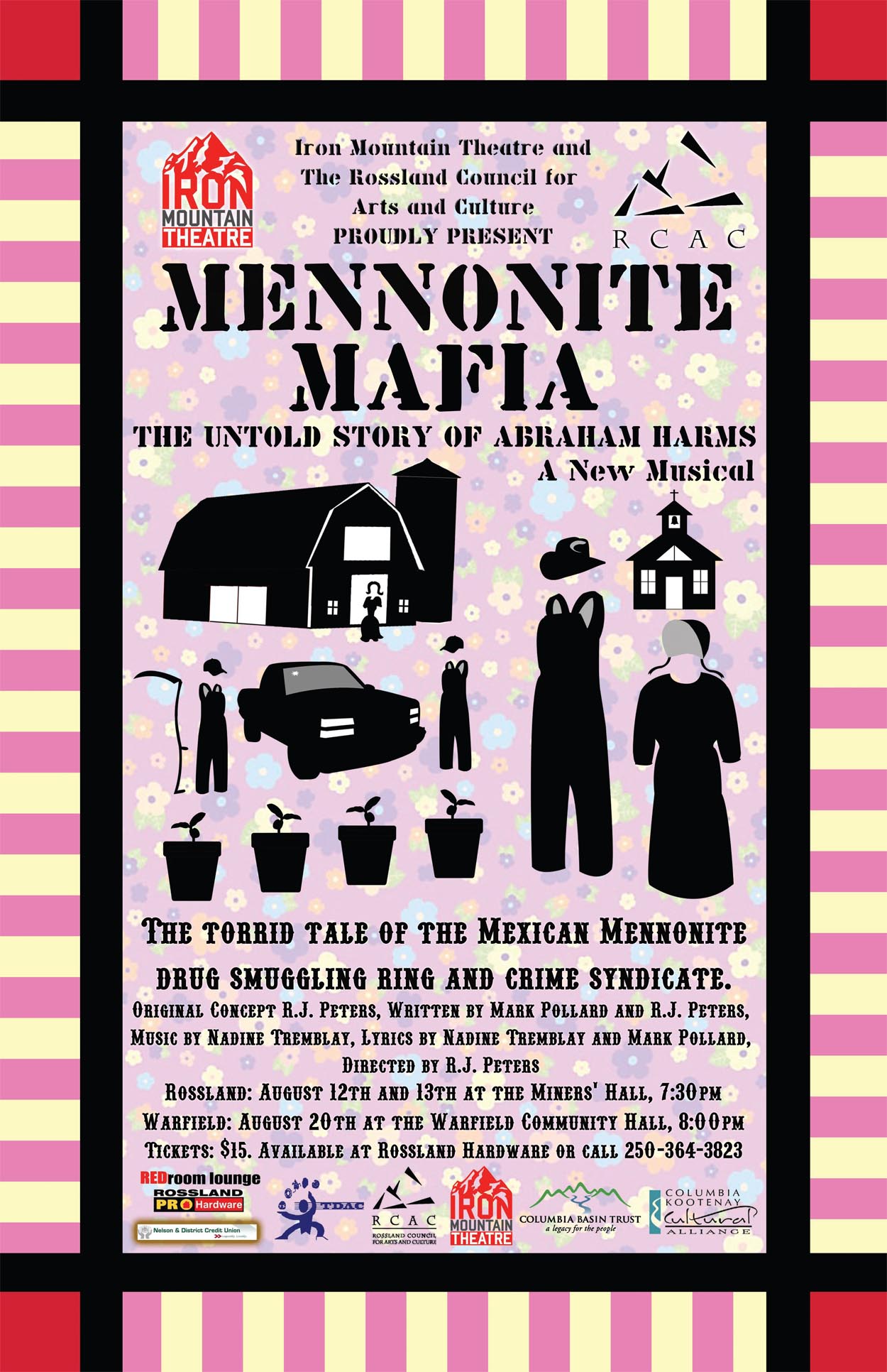 Written by R.J. Peters & Mark Pollard, with music by Nadine Tremblay, Mennonite Mafia tells the real life story of Chuatemac Resident Abraham Harms, a practicing Mexican Mennonite. Abraham brought his family from Canada to Mexico to escape new laws from Canada that were not in line with his beliefs. Upon arrival, he discovers his new home of Chuatemac to be stricken by a longstanding drought and when newly founded trade relations between North America come to fruition, Abraham finds himself unable to farm or sell his handcrafted furniture across the border. With times as desperate as they can get, Abraham decides to team up with local drug cartel in the transportation of their goods across the border and forms the first ever: Mennonite Mafia!